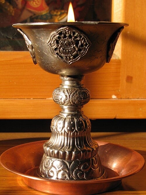 A Buddhist butter lamp is a traditional, often metal, chalice-shaped vessel used in Tibetan Buddhism to burn clarified yak butter (or oil) as a sacred offering of light. Placed on household shrines or in monasteries, they symbolize the illumination of wisdom, dispelling ignorance and negativity.